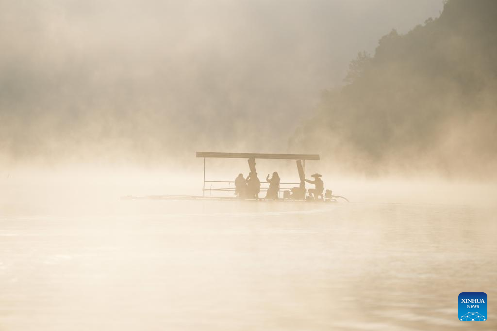 Tourists view bald cypress forests on sightseeing rafts at a wetland park in Fangtang Township of Ningguo City, east China's Anhui Province, Nov. 7, 2024. (Xinhua/Chen Yehua)