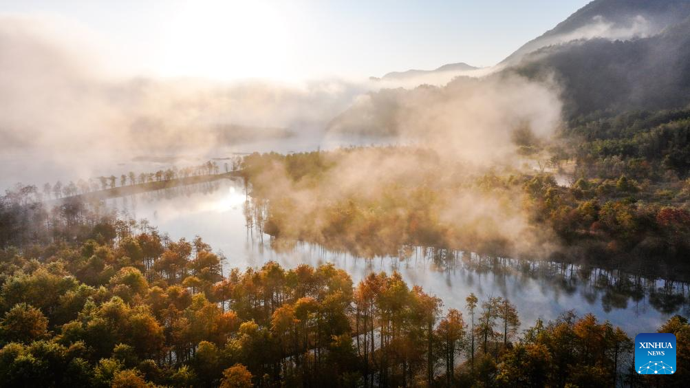 An aerial drone photo taken on Nov. 7, 2024 shows bald cypress forests at a wetland park in Fangtang Township of Ningguo City, east China's Anhui Province. (Xinhua/Chen Yehua)