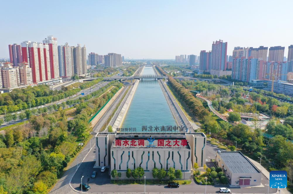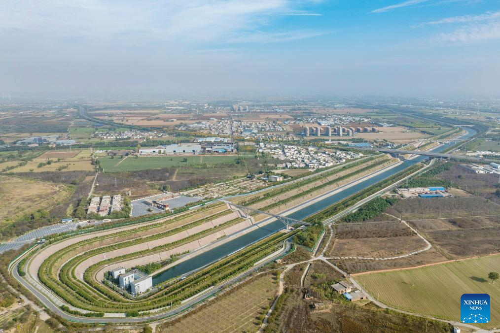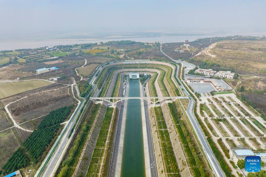 An aerial drone photo taken on Nov. 5, 2024 shows the main canal of China's South-to-North Water Diversion Project in Jiaozuo, central China's Henan Province. China's South-to-North Water Diversion Project has three routes. The middle route, which is the most prominent one, begins at the Danjiangkou Reservoir in central China's Hubei Province and runs through Henan and Hebei before reaching Beijing and Tianjin. It began supplying water in December 2014. (Xinhua/Hao Yuan)