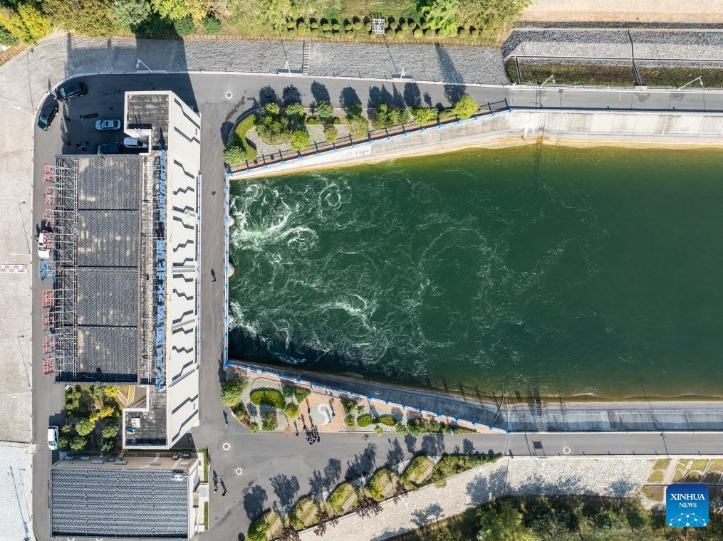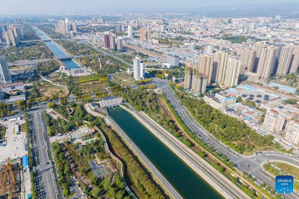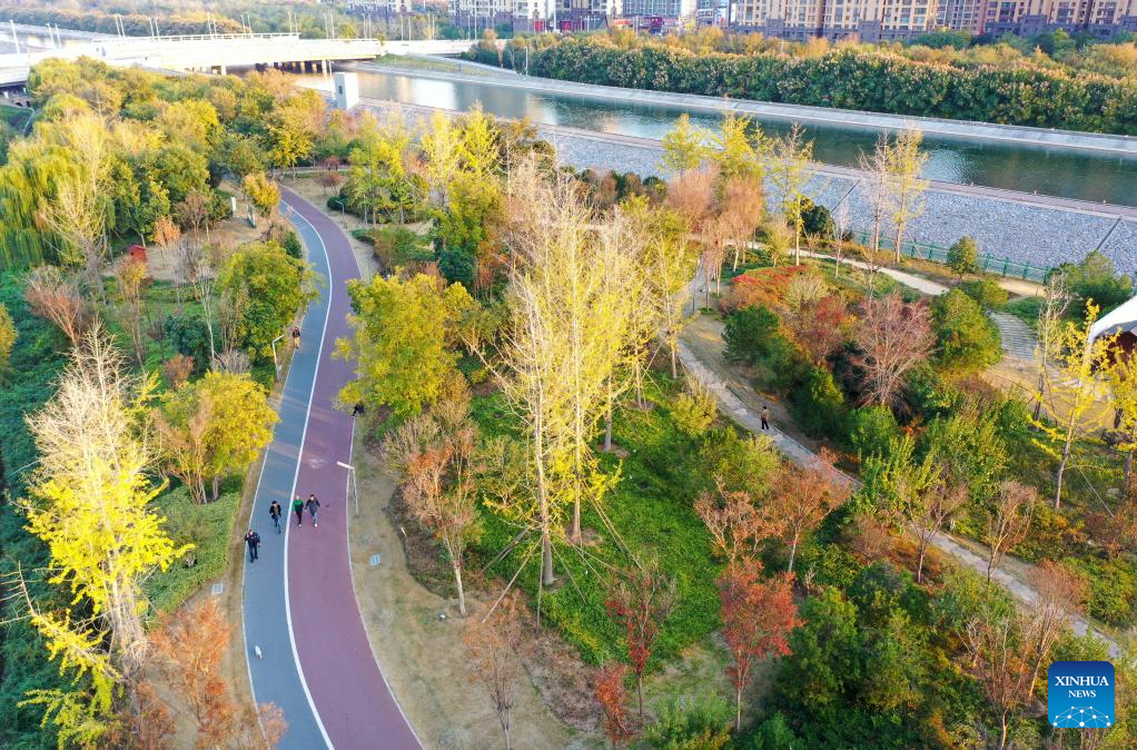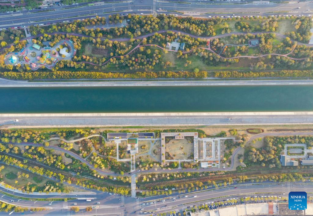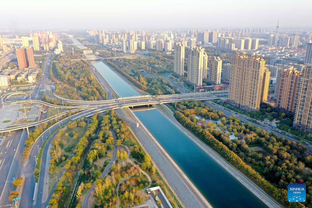 An aerial drone photo taken on Nov. 5, 2024 shows Tianhe Park along the main canal of China's South-to-North Water Diversion Project in Jiaozuo, central China's Henan Province. China's South-to-North Water Diversion Project has three routes. The middle route, which is the most prominent one, begins at the Danjiangkou Reservoir in central China's Hubei Province and runs through Henan and Hebei before reaching Beijing and Tianjin. It began supplying water in December 2014. (Xinhua/Hao Yuan)