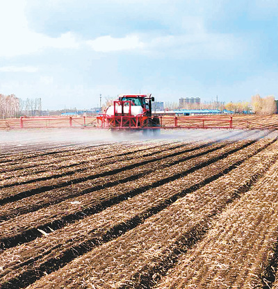 A machine sprays pesticides at Youyi Farm under the Beidahuang Group in northeast China's Heilongjiang Province. (Photo/Gu Jinzhou)