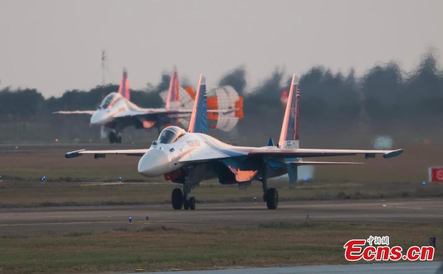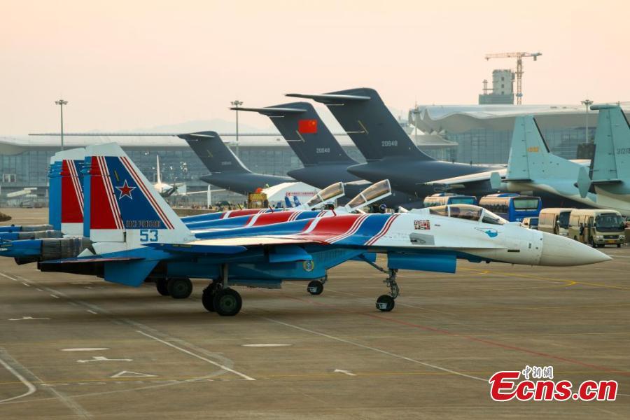 Six Su-35S heavy fighter jets and one Su-30SM fighter jet of the Russian Warrior Aerobatic Team arrive at the Zhuhai International Air Show Center, south China's Guangdong Province, Nov. 7, 2024. (Photo: China News Service/Chen Jimin)