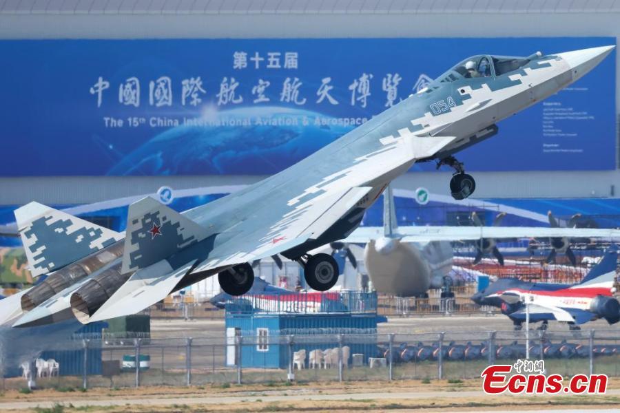A Russian Sukhoi Su-57 stealth fighter jet conducts a test flight ahead of the 15th Airshow China at the Zhuhai International Air Show Center, south China's Guangdong Province, Nov. 7, 2024. (Photo: China News Service/Chen Jimin)