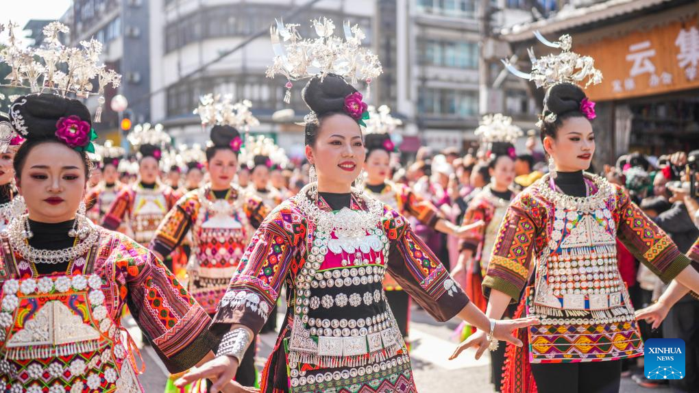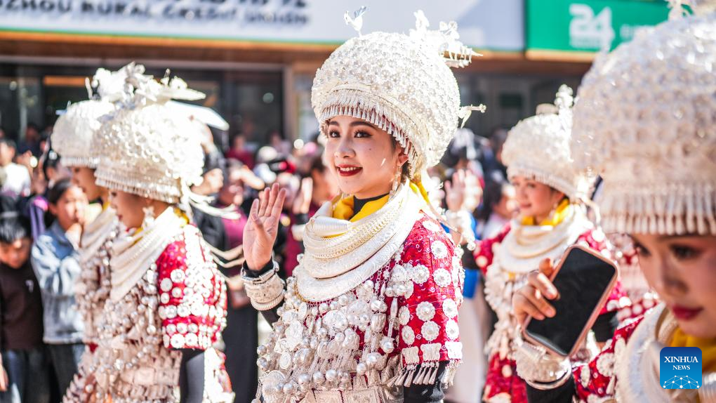People of Miao ethnic group in traditional costumes take part in a parade to celebrate the Miao New Year at Leishan County of Qiandongnan Miao and Dong Autonomous Prefecture, southwest China's Guizhou Province, Nov. 10, 2024. Miao New Year is a major festival of people of Miao ethnic group. In 2008, the festival was listed as a national-level intangible cultural heritage. (Xinhua/Tao Liang)