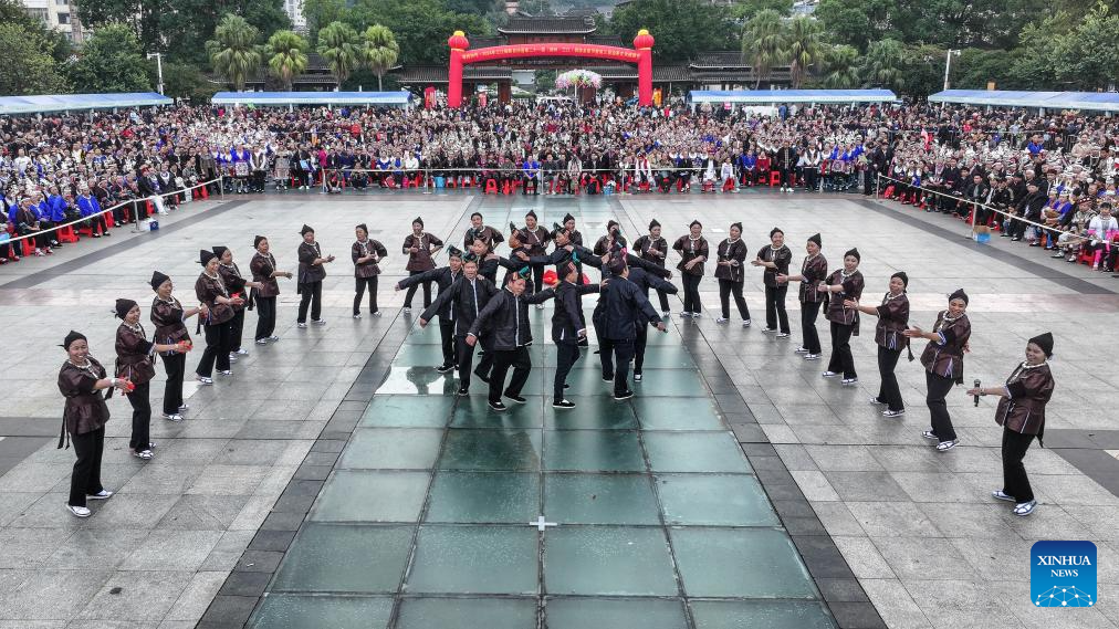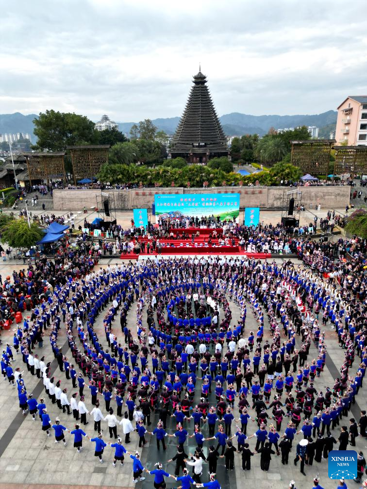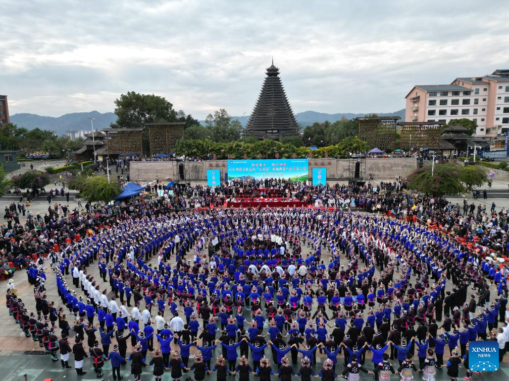 People attend a celebration of Duoye festival at Duoye Square in Sanjiang Dong Autonomous County, south China's Guangxi Zhuang Autonomous Region, Nov. 9, 2024. Various activities including dancing, oil tea feast, and folk art performances were held here on Saturday to celebrate the traditional Duoye festival, an occasion during which the Dong people used to gather around in a circle to chant their prayers. (Xinhua/Zhang Ailin)
