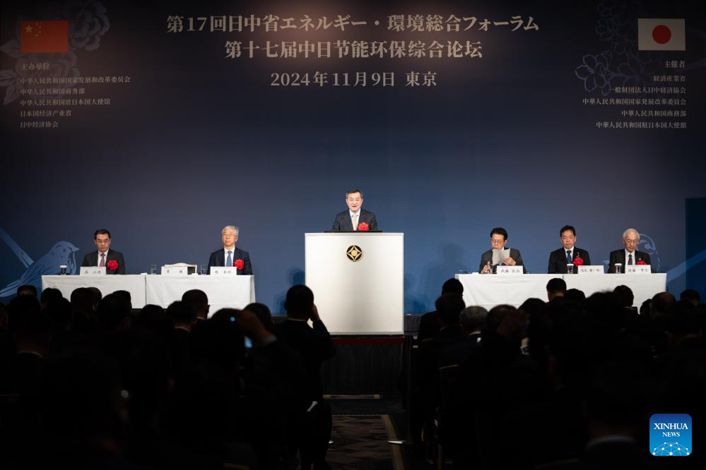 Zhao Chenxin (C), deputy head of China's National Development and Reform Commission, delivers a speech at the 17th China-Japan Comprehensive Forum on Energy Saving and Environmental Protection in Tokyo, Japan, Nov. 9, 2024. (Xinhua/Zhang Xiaoyu)
