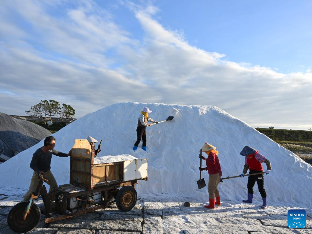 Workers transfer crude salt at Shanyao salt field in Quanzhou City, southeast China's Fujian Province, Nov. 9, 2024. Covering an area of 920 hectares, the Shanyao salt field adheres to the traditional sun-drying techniques, and annually turns out 65,000 tonnes of sea salt. The Fujian traditional sun-drying techniques for sea salt production (Quanzhou style) was inscribed in the list of provincial intangible cultural heritage in 2022. (Xinhua/Jiang Kehong)