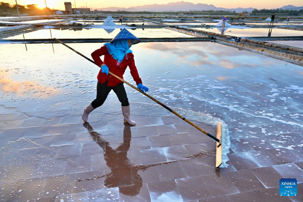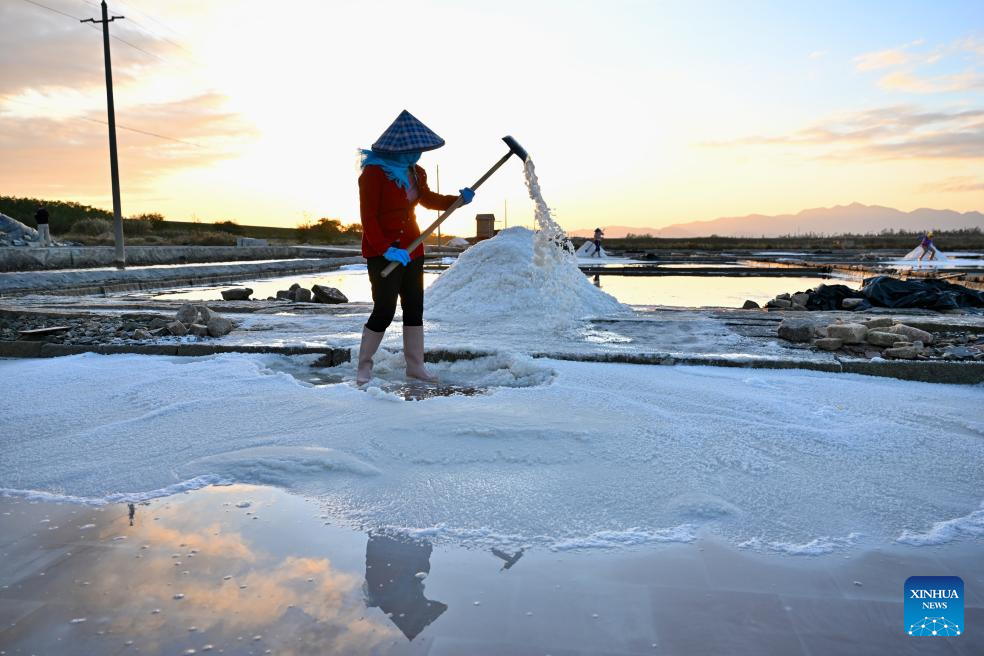 A worker operates at Shanyao salt field in Quanzhou City, southeast China's Fujian Province, Nov. 8, 2024. Covering an area of 920 hectares, the Shanyao salt field adheres to the traditional sun-drying techniques, and annually turns out 65,000 tonnes of sea salt. The Fujian traditional sun-drying techniques for sea salt production (Quanzhou style) was inscribed in the list of provincial intangible cultural heritage in 2022. (Xinhua/Jiang Kehong)