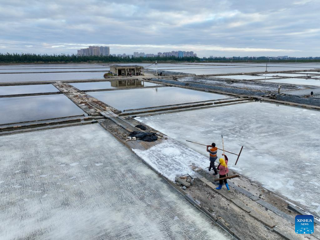 An aerial drone photo taken on Nov. 8, 2024 shows people working at Shanyao salt field in Quanzhou City, southeast China's Fujian Province. Covering an area of 920 hectares, the Shanyao salt field adheres to the traditional sun-drying techniques, and annually turns out 65,000 tonnes of sea salt. The Fujian traditional sun-drying techniques for sea salt production (Quanzhou style) was inscribed in the list of provincial intangible cultural heritage in 2022. (Xinhua/Jiang Kehong)