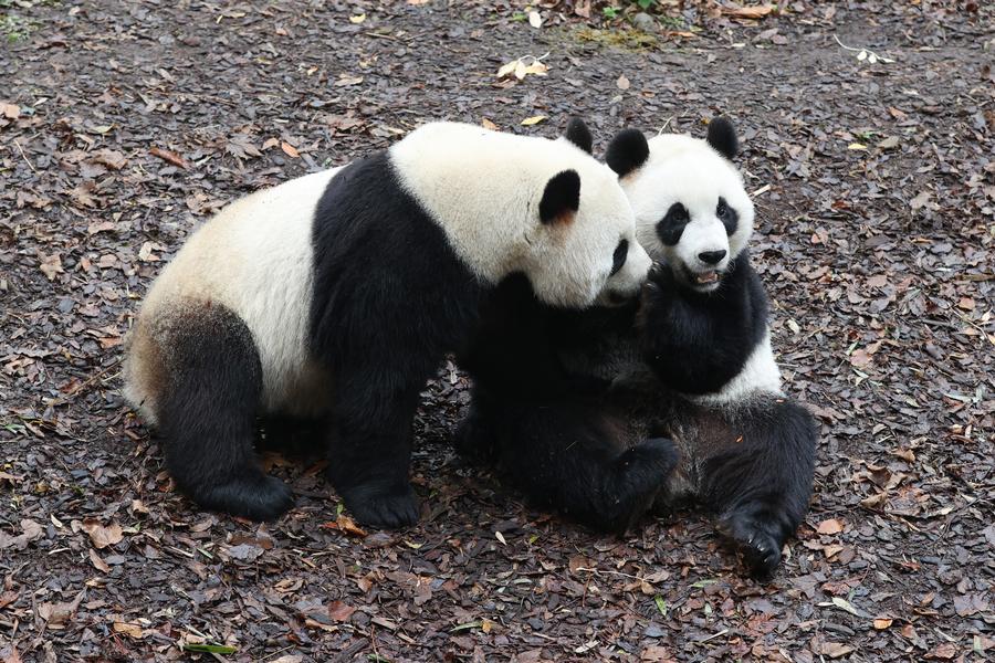 Giant panda twins Bao Di (L) and Bao Mei are pictured at the Pairi Daiza zoo in Brugelette, Belgium, Nov. 10, 2024. (Xinhua/Zhao Dingzhe)