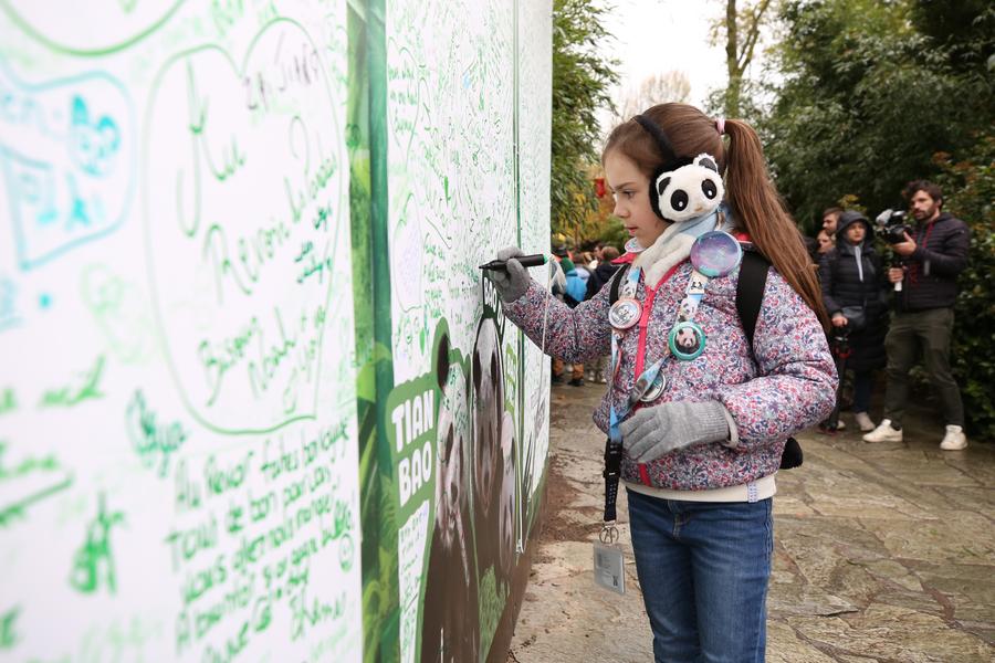 A girl leaves her blessing message on a billboard for giant pandas at the Pairi Daiza zoo in Brugelette, Belgium, Nov. 10, 2024. (Xinhua/Zhao Dingzhe)