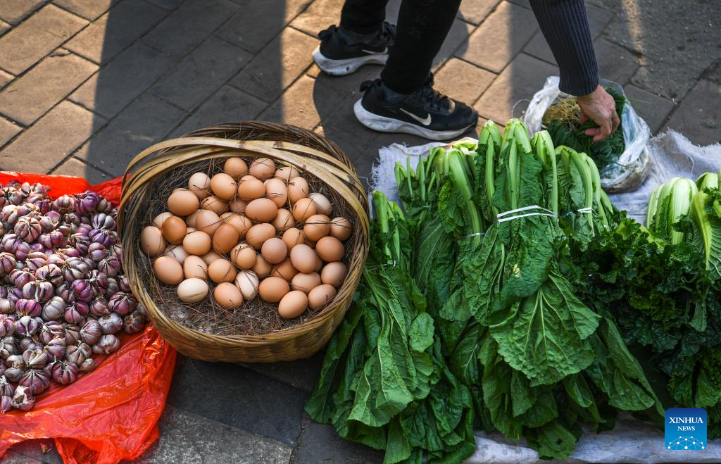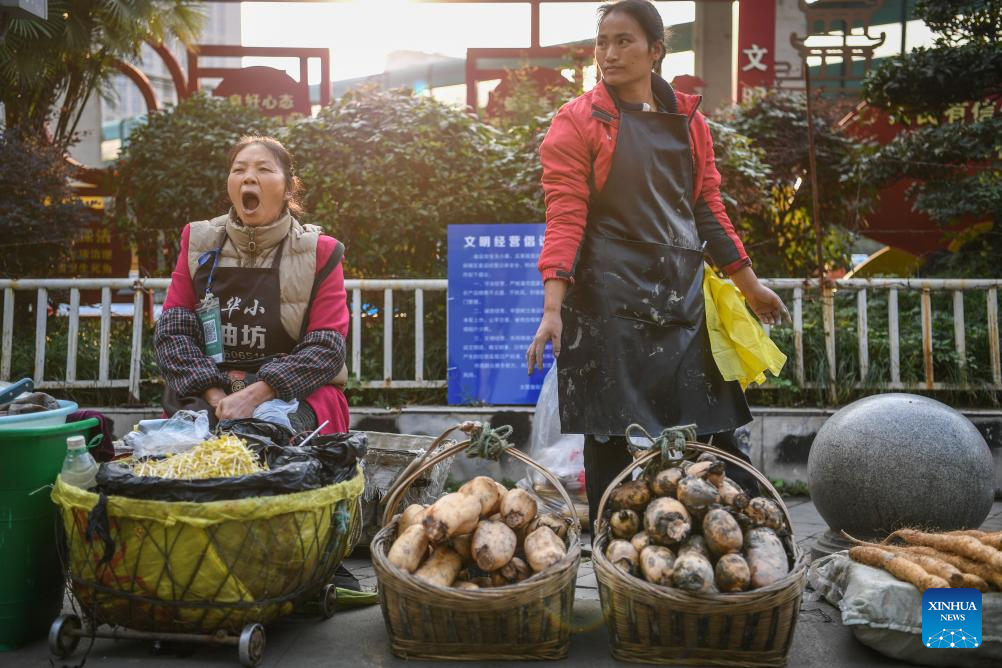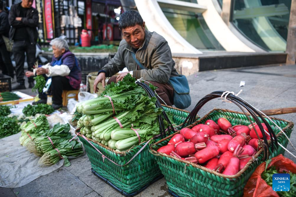 Farmers, who took Bus No. 252 to the city, sell vegetables in Yunyan District of Guiyang City, southwest China's Guizhou Province, Nov. 7, 2024. Bus No. 252, running between a rural area and urban district of Guiyang City, opened a special line in June this year to facilitate villagers along the line to sell their agricultural products. (Xinhua/Yang Wenbin)