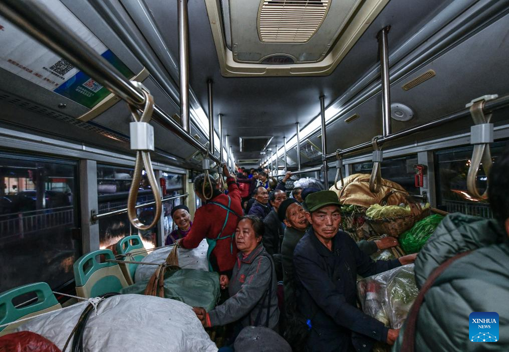 Farmers take Bus No. 252 to sell vegetables in Guiyang City, southwest China's Guizhou Province, Nov. 7, 2024. Bus No. 252, running between a rural area and urban district of Guiyang City, opened a special line in June this year to facilitate villagers along the line to sell their agricultural products.(Xinhua/Yang Wenbin)