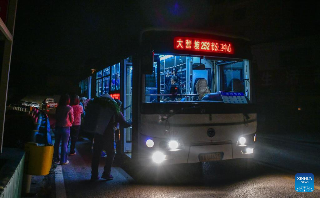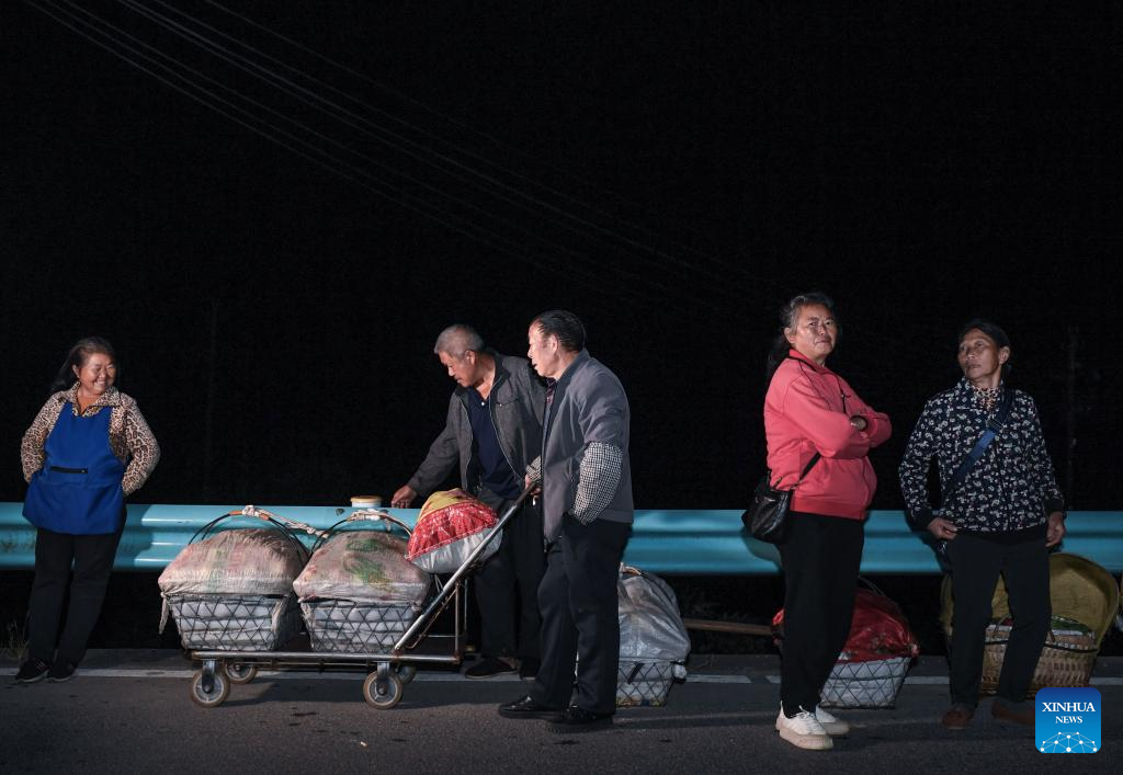 Farmers prepare to sell vegetables after getting off at the terminal station of Bus No. 252 in Yunyan District in Guiyang City, southwest China's Guizhou Province, Nov. 7, 2024. Bus No. 252, running between a rural area and urban district of Guiyang City, opened a special line in June this year to facilitate villagers along the line to sell their agricultural products.(Xinhua/Yang Wenbin)