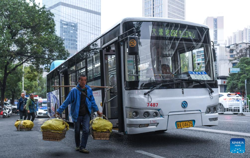 A farmer gets off at the terminal station of Bus No. 252 in Yunyan District in Guiyang City, southwest China's Guizhou Province, Nov. 7, 2024. Bus No. 252, running between a rural area and urban district of Guiyang City, opened a special line in June this year to facilitate villagers along the line to sell their agricultural products.(Xinhua/Yang Wenbin)