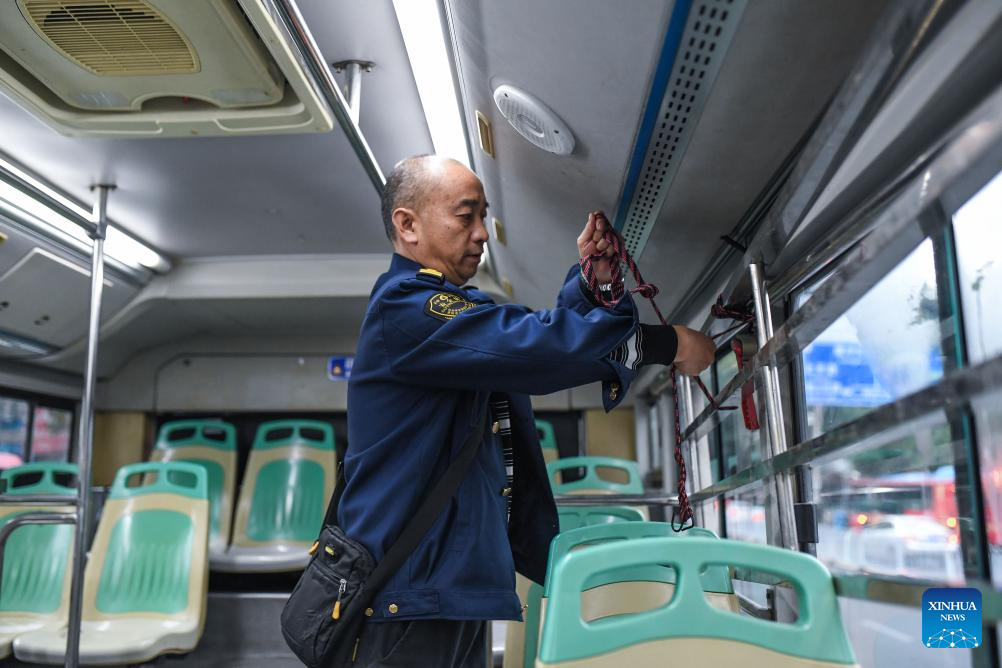 Bus driver Zhang Guilin cleans a shelve on Bus No. 252 at the terminal station in Yunyan District in Guiyang City, southwest China's Guizhou Province, Nov. 7, 2024. Bus No. 252, running between a rural area and urban district of Guiyang City, opened a special line in June this year to facilitate villagers along the line to sell their agricultural products. (Xinhua/Yang Wenbin)