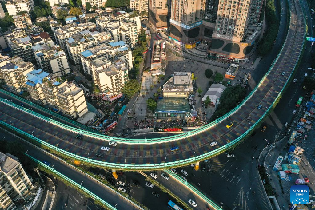 An aerial drone photo taken on Nov. 10, 2024 shows Bus No. 252 running in Shuitian Town of Wudang District, Guiyang City, southwest China's Guizhou Province. Bus No. 252, running between a rural area and urban district of Guiyang City, opened a special line in June this year to facilitate villagers along the line to sell their agricultural products.(Xinhua/Yang Wenbin)