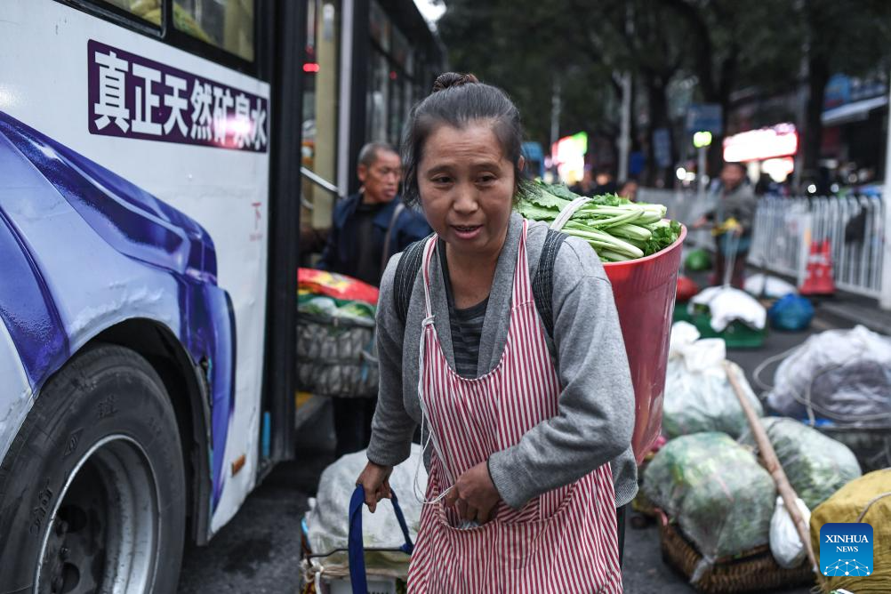 A farmer prepares to sell vegetables after getting off at the terminal station of Bus No. 252 in Yunyan District in Guiyang City, southwest China's Guizhou Province, Nov. 7, 2024. Bus No. 252, running between a rural area and urban district of Guiyang City, opened a special line in June this year to facilitate villagers along the line to sell their agricultural products. (Xinhua/Yang Wenbin)