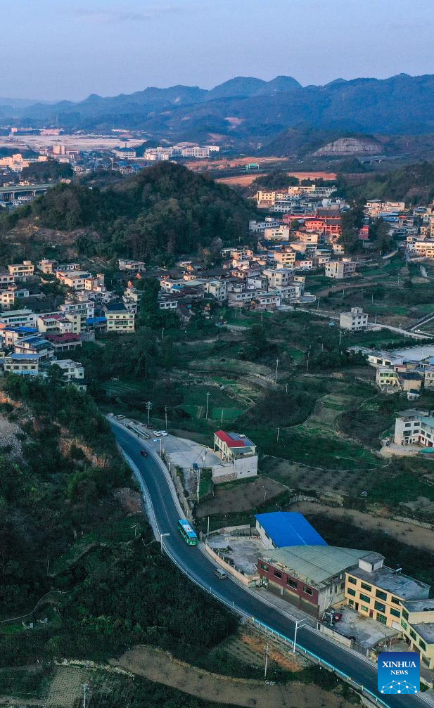 An aerial drone photo taken on Nov. 10, 2024 shows Bus No. 252 running in Shuitian Town of Wudang District, Guiyang City, southwest China's Guizhou Province. Bus No. 252, running between a rural area and urban district of Guiyang City, opened a special line in June this year to facilitate villagers along the line to sell their agricultural products. (Xinhua/Yang Wenbin)