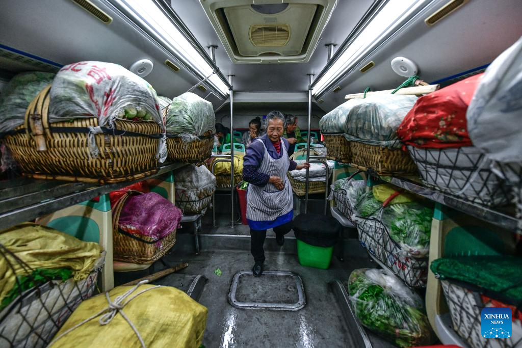 Farmers take Bus No. 252 to sell vegetables in Guiyang City, southwest China's Guizhou Province, Nov. 7, 2024. Bus No. 252, running between a rural area and urban district of Guiyang City, opened a special line in June this year to facilitate villagers along the line to sell their agricultural products. (Xinhua/Yang Wenbin)