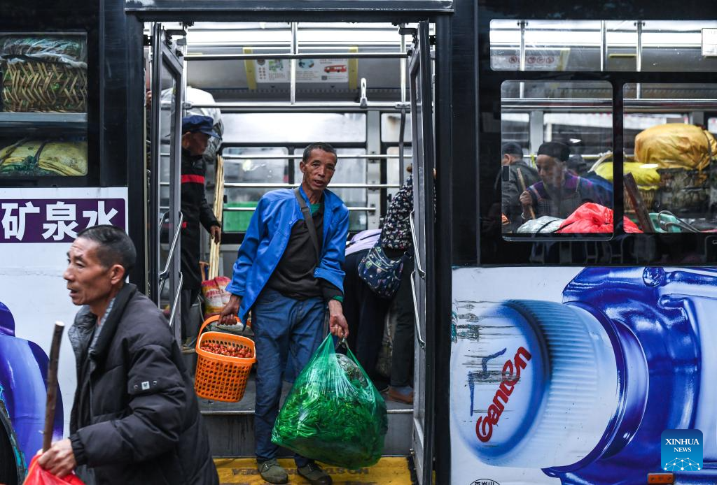 Farmers get on Bus No. 252 at Dingba Village in Shuitian Town of Wudang District, Guiyang City, southwest China's Guizhou Province, Nov. 7, 2024. Bus No. 252, running between a rural area and urban district of Guiyang City, opened a special line in June this year to facilitate villagers along the line to sell their agricultural products.(Xinhua/Yang Wenbin)