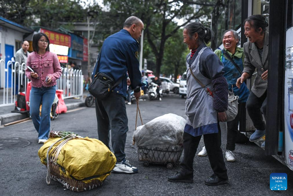 Farmers, who took Bus No. 252 to the city, sell vegetables in Yunyan District of Guiyang City, southwest China's Guizhou Province, Nov. 7, 2024. Bus No. 252, running between a rural area and urban district of Guiyang City, opened a special line in June this year to facilitate villagers along the line to sell their agricultural products.(Xinhua/Yang Wenbin)