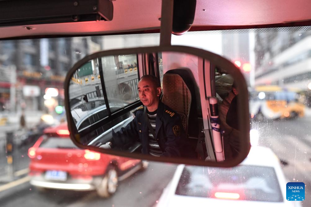 Bus driver Zhang Guilin is seen at work on Bus No. 252 in Guiyang City, southwest China's Guizhou Province, Nov. 7, 2024. Bus No. 252, running between a rural area and urban district of Guiyang City, opened a special line in June this year to facilitate villagers along the line to sell their agricultural products. (Xinhua/Yang Wenbin)