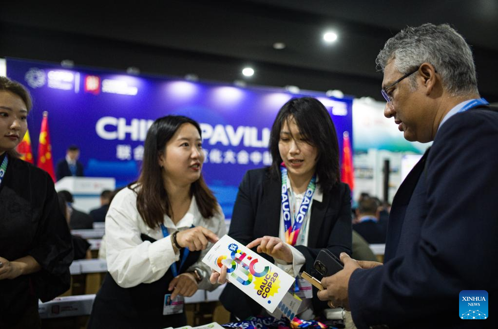 Staff members brief a pamphlet to a guest during a side meeting marking the opening of the China Pavilion at the 29th session of the Conference of the Parties to the United Nations Framework Convention on Climate Change (UNFCCC), or COP29, in Baku, Azerbaijan, Nov. 11, 2024. The China Pavilion at COP29 was launched on Monday in Baku, Azerbaijan. The China Pavilion will host 10 themed days featuring various side activities during COP29, scheduled to run from Nov. 11 to 22. (Xinhua/Meng Jing)