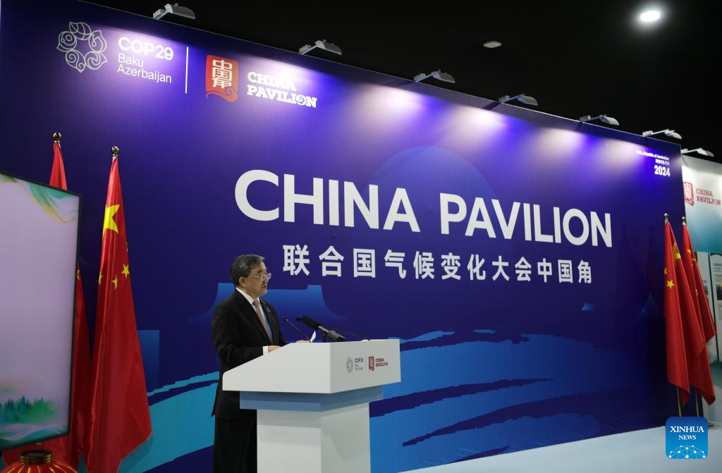 Liu Zhenmin, China's special envoy for climate change, speaks at a side meeting marking the opening of the China Pavilion at the 29th session of the Conference of the Parties to the United Nations Framework Convention on Climate Change (UNFCCC), or COP29, in Baku, Azerbaijan, Nov. 11, 2024. The China Pavilion at COP29 was launched on Monday in Baku, Azerbaijan. The China Pavilion will host 10 themed days featuring various side activities during COP29, scheduled to run from Nov. 11 to 22. (Xinhua/Meng Jing)