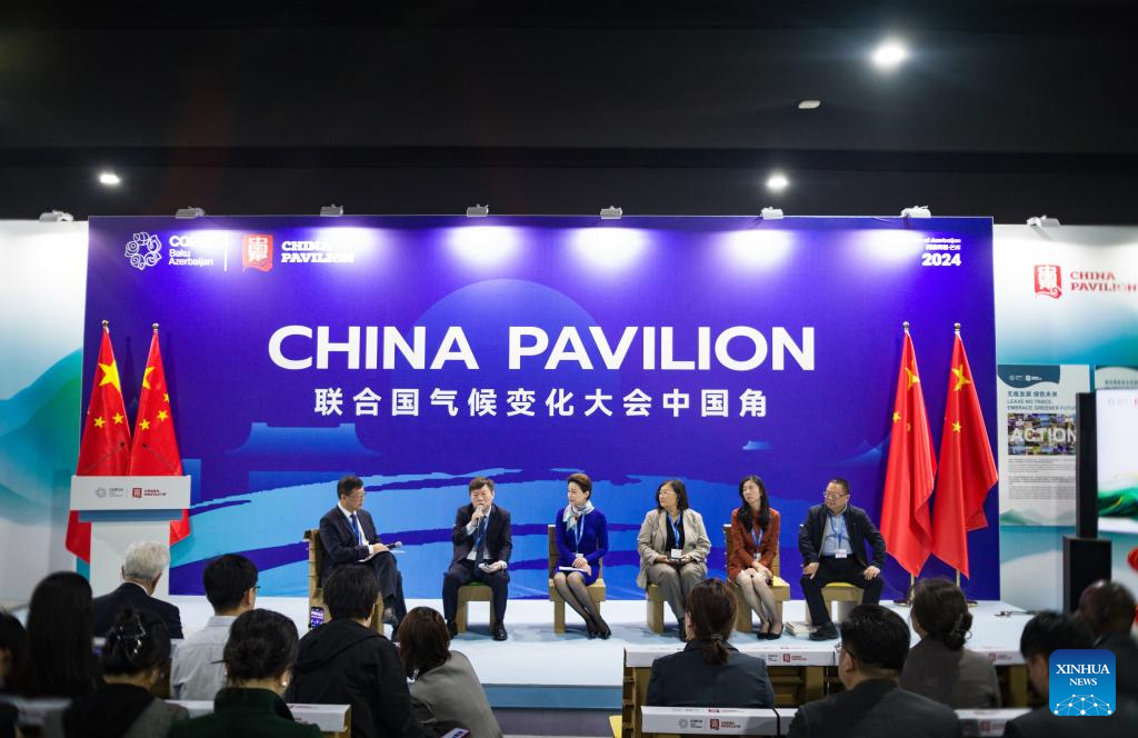 People attend a side meeting marking the opening of the China Pavilion at the 29th session of the Conference of the Parties to the United Nations Framework Convention on Climate Change (UNFCCC), or COP29, in Baku, Azerbaijan, Nov. 11, 2024. The China Pavilion at COP29 was launched on Monday in Baku, Azerbaijan. The China Pavilion will host 10 themed days featuring various side activities during COP29, scheduled to run from Nov. 11 to 22. (Xinhua/Meng Jing)