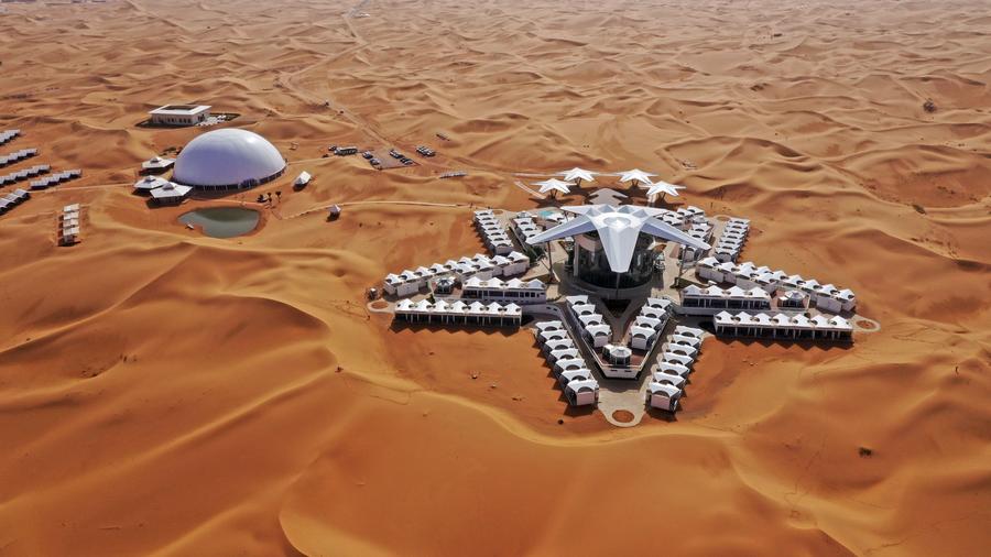 This aerial photo taken on July 20, 2023 shows a resort in the Tengger Desert in the Shapotou scenic spot in Zhongwei, northwest China's Ningxia Hui Autonomous Region. (Xinhua/Wang Peng)