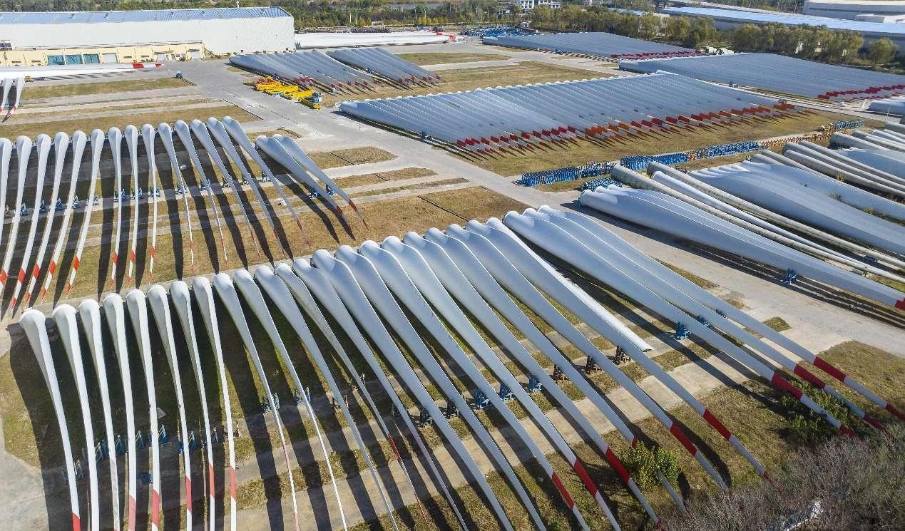 Wind turbine blades manufactured by a company in Yancheng, east China's Jiangsu province are about to be exported. (People's Daily Online/Ji Haixin)
