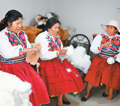 Workers make alpaca toys at a workshop in Arequipa, Peru. (Xinhua/Li Muzi)