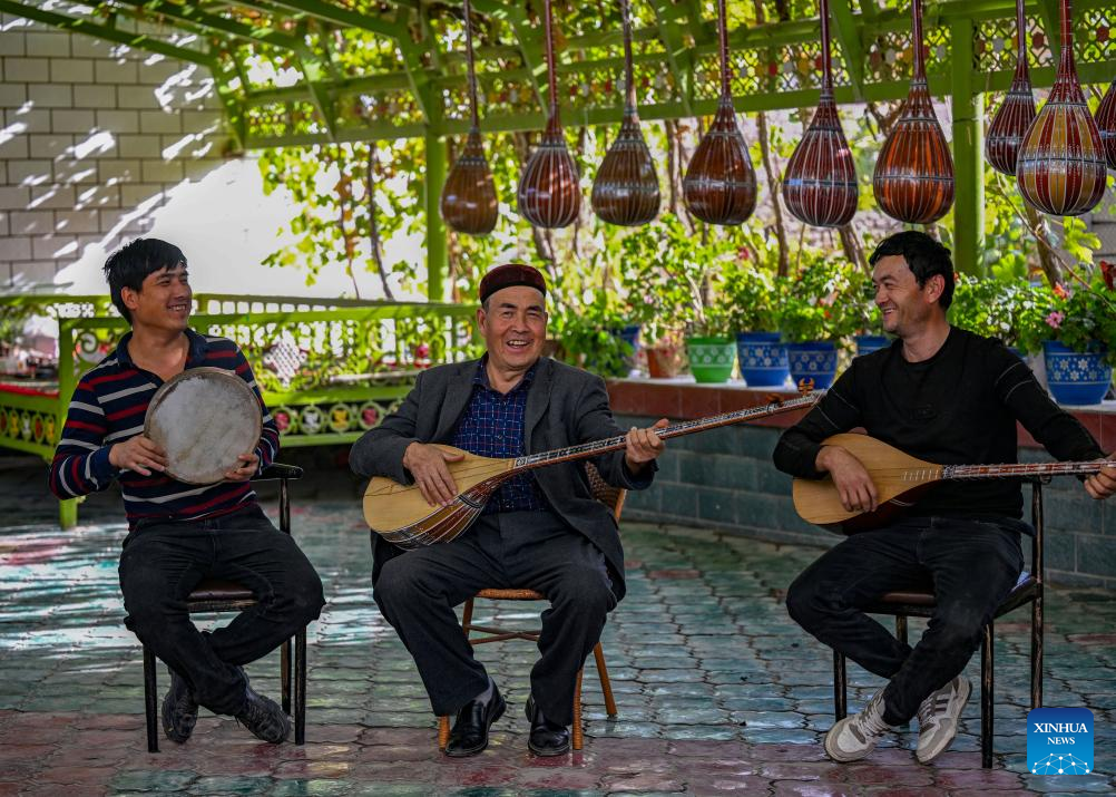 Nurdun Esmayil (C) plays music with his son, Ehmet Nurdun (L), and his apprentice in his courtyard in Xinhe County, northwest China's Xinjiang Uygur Autonomous Region, Oct. 15, 2024. (Xinhua/Chen Shuo)