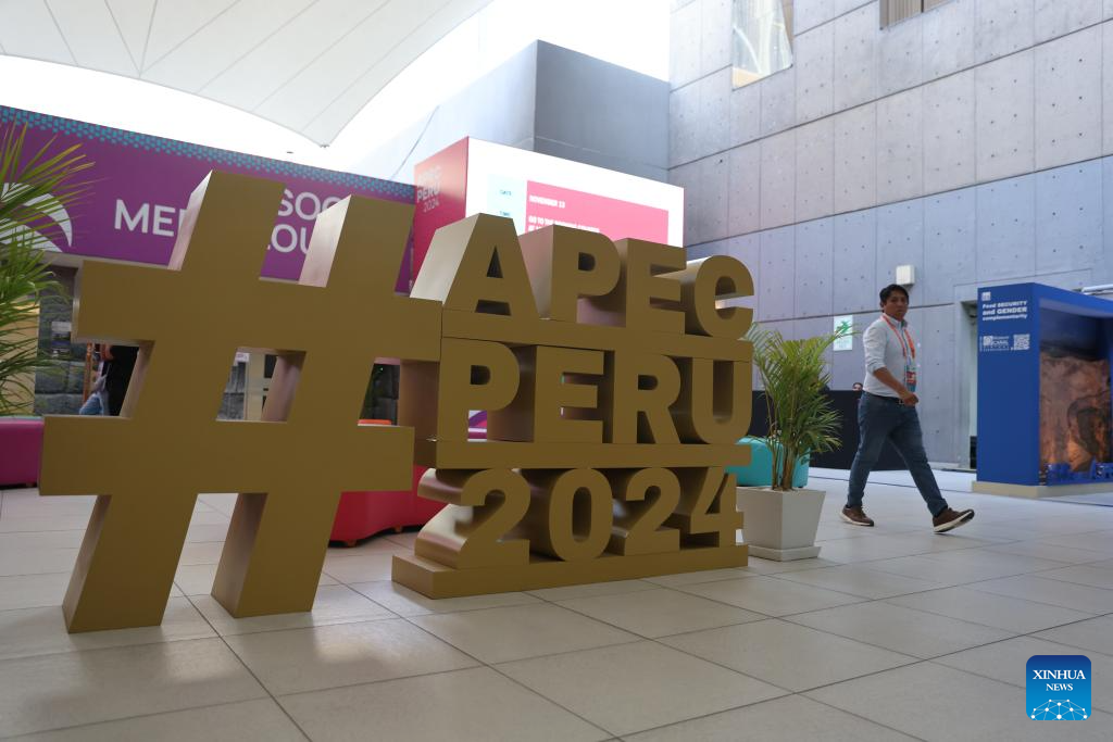 This photo shows the logo of APEC 2024 at the APEC 2024 International Media Center in Lima, Peru, Nov. 13, 2024. The 31st APEC Economic Leaders' Meeting will be held in Lima. (Xinhua/Li Mengxin)