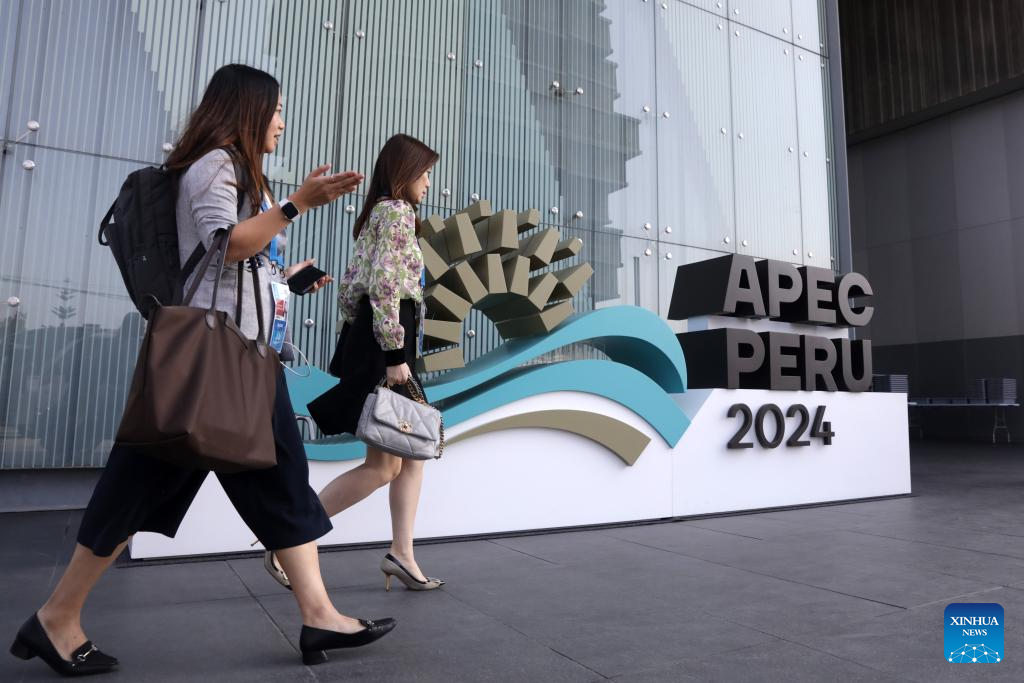 People walk past the logo of APEC 2024 outside the Lima Convention Center in Lima, Peru, Nov. 13, 2024. The 31st APEC Economic Leaders' Meeting will be held in Lima. (Xinhua/Mariana Bazo)