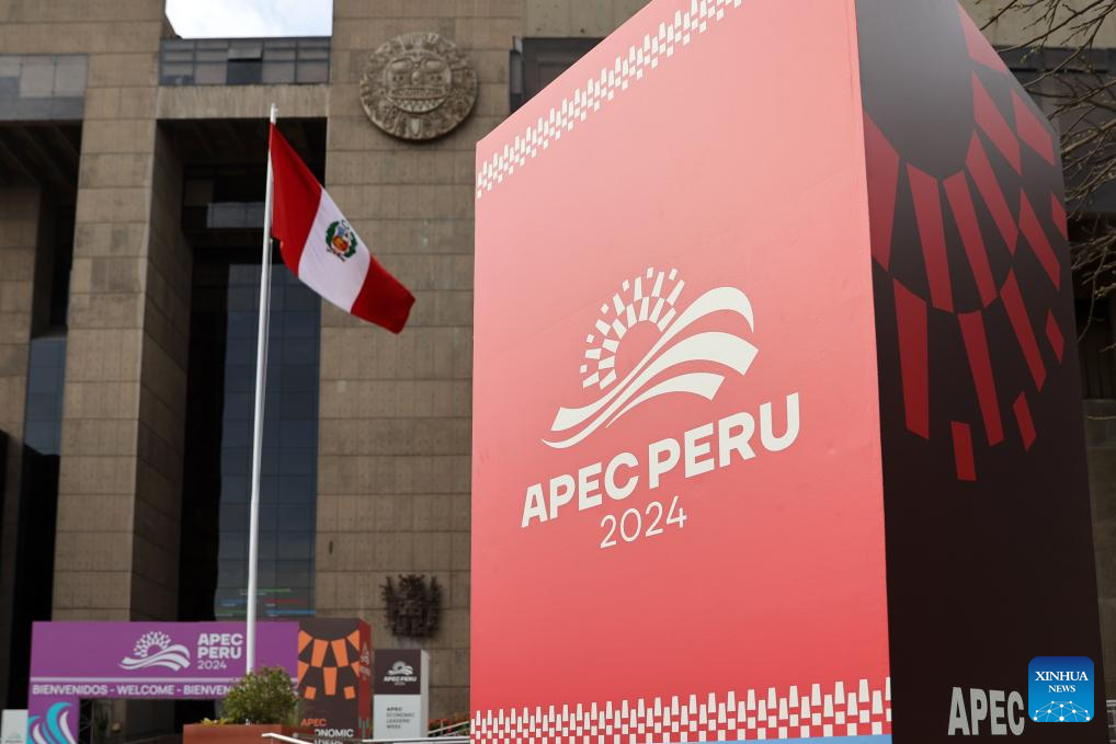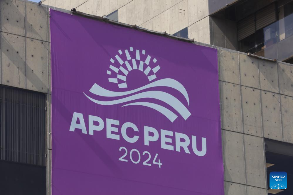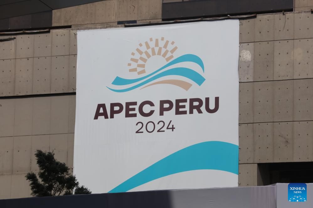 This photo shows the logo of APEC 2024 in Lima, Peru, Nov. 10, 2024. The 31st APEC Economic Leaders' Meeting will be held in Lima. (Xinhua/Li Muzi)
