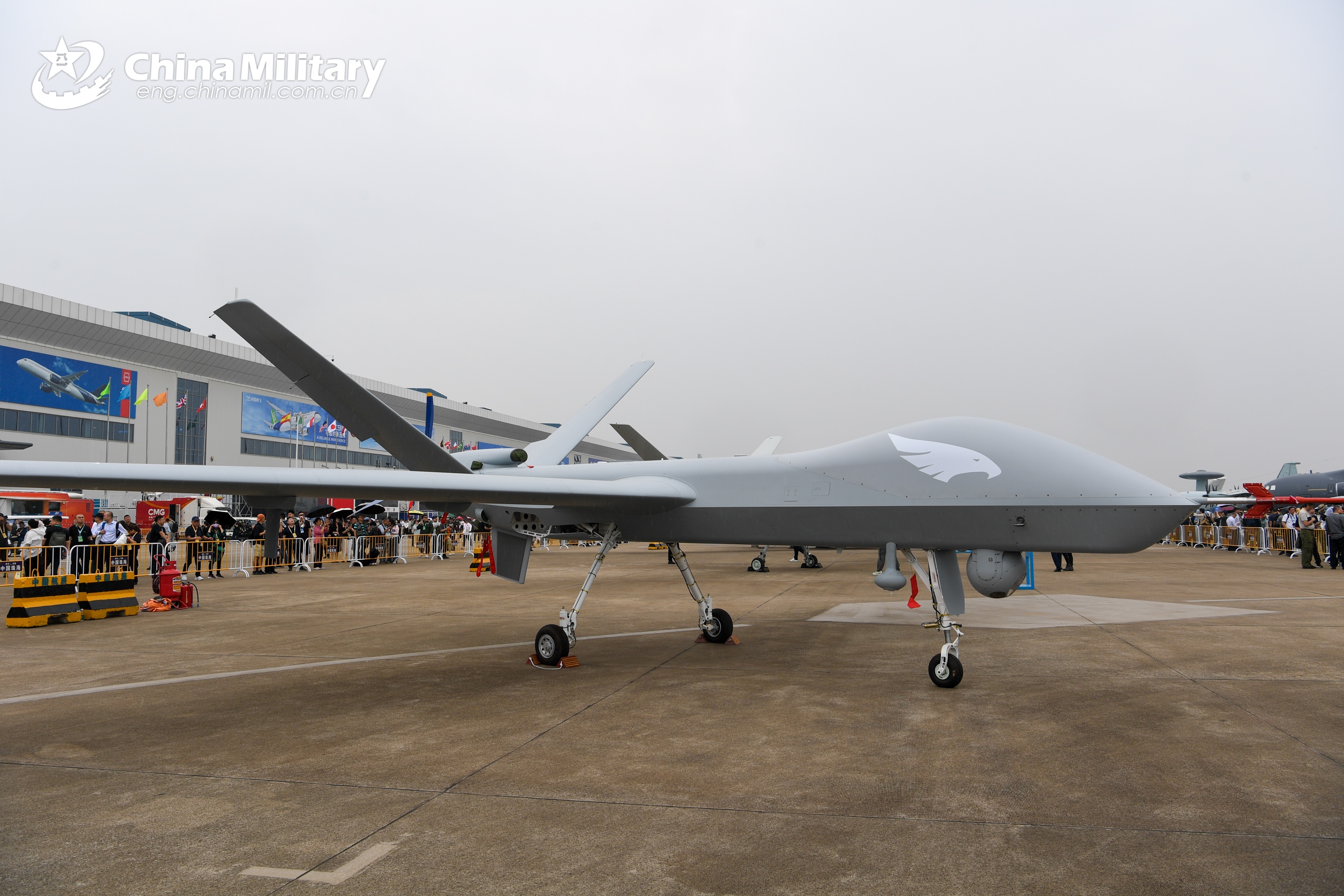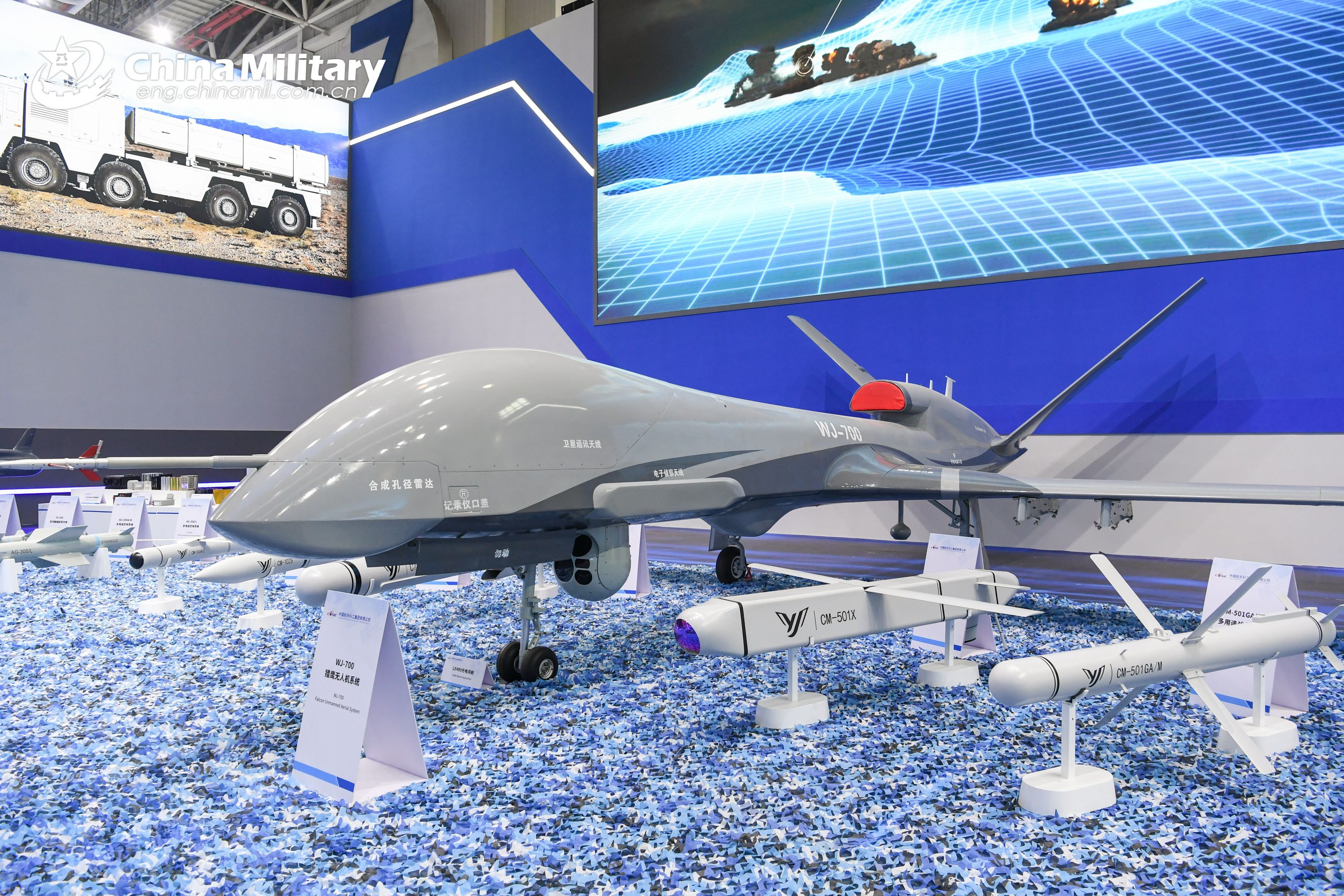 A WJ-700 falcon unmanned aerial vehicle (UAV) is on static display during the airshow in Zhuhai, south China's Guangdong Province, on November 13, 2024. The 15th China International Aviation and Aerospace Exhibition, also known as Airshow China 2024, kicked off in Zhuhai on Tuesday. (eng.chinamil.com.cn/Photo by Liang Xu)