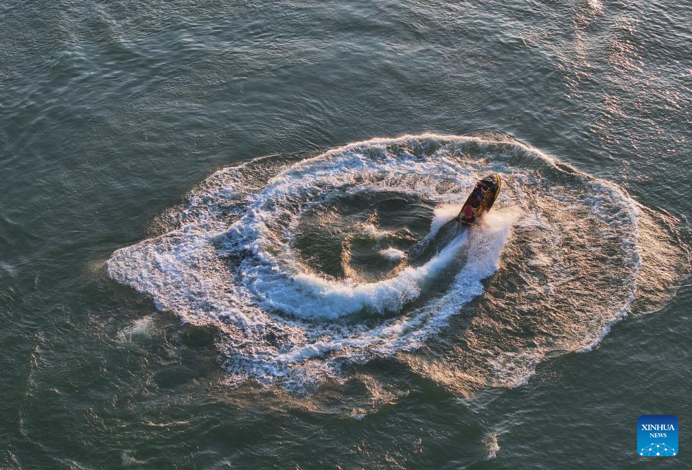 An aerial drone photo shows tourists experiencing motorboat in Sizhou Village of Changzhou District in Wuzhou, south China's Guangxi Zhuang Autonomous Region, Nov. 13, 2024. Local authorities in Changzhou District have actively developed cultural tourism in an effort to advance rural revitalization. (Xinhua/Huang Xiaobang)