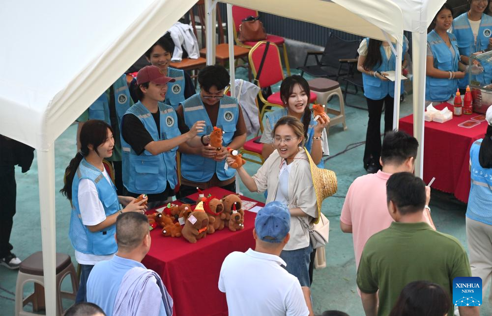 College students promote cultural tourism products to tourists during a social practice project in Fuwan Village of Changzhou District in Wuzhou, south China's Guangxi Zhuang Autonomous Region, Nov. 13, 2024. Local authorities in Changzhou District have actively developed cultural tourism in an effort to advance rural revitalization. (Xinhua/Huang Xiaobang)