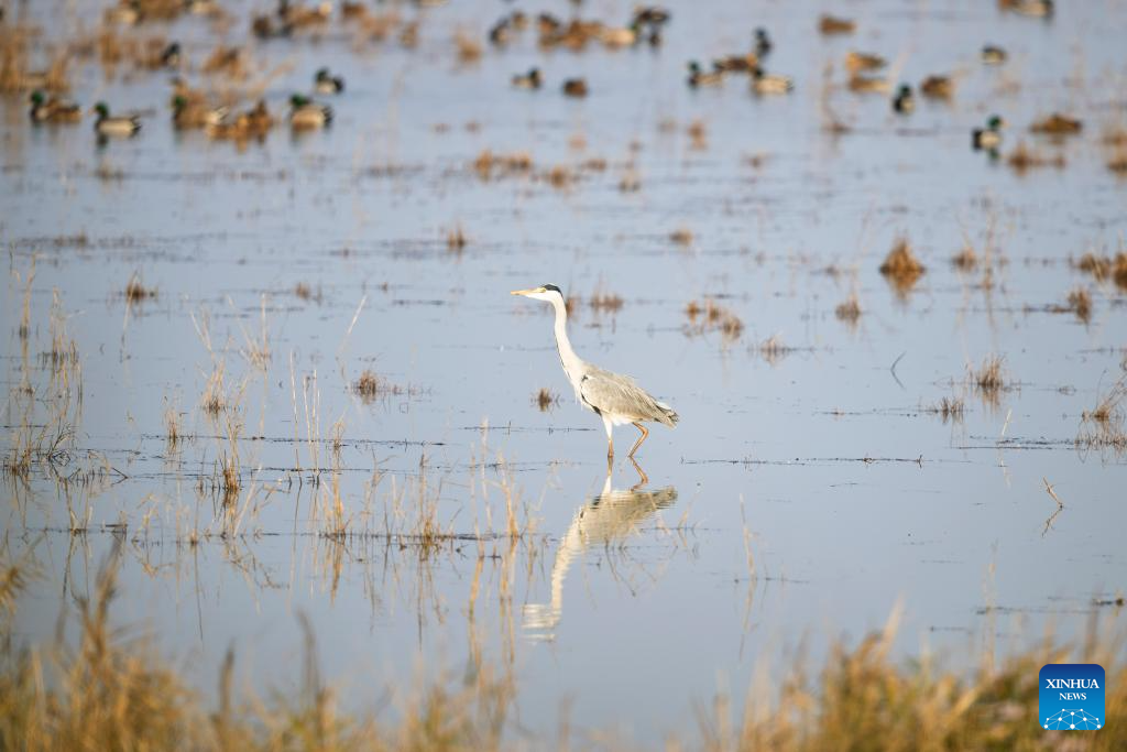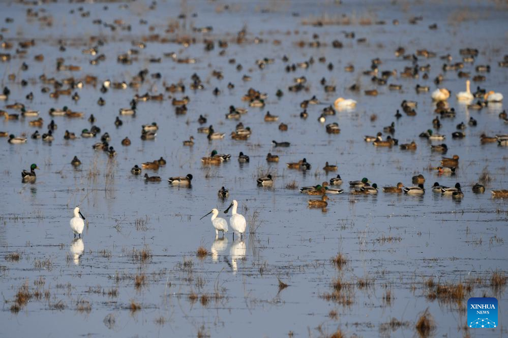 Migrant birds are seen at Chongming Dongtan National Nature Reserve in east China's Shanghai, Nov. 12, 2024. A large number of migrant birds winter at the reserve. (Xinhua/Li Bo)