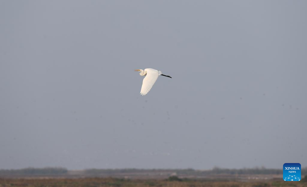 An egret flies at Chongming Dongtan National Nature Reserve in east China's Shanghai, Nov. 12, 2024. A large number of migrant birds winter at the reserve. (Xinhua/Li Bo)