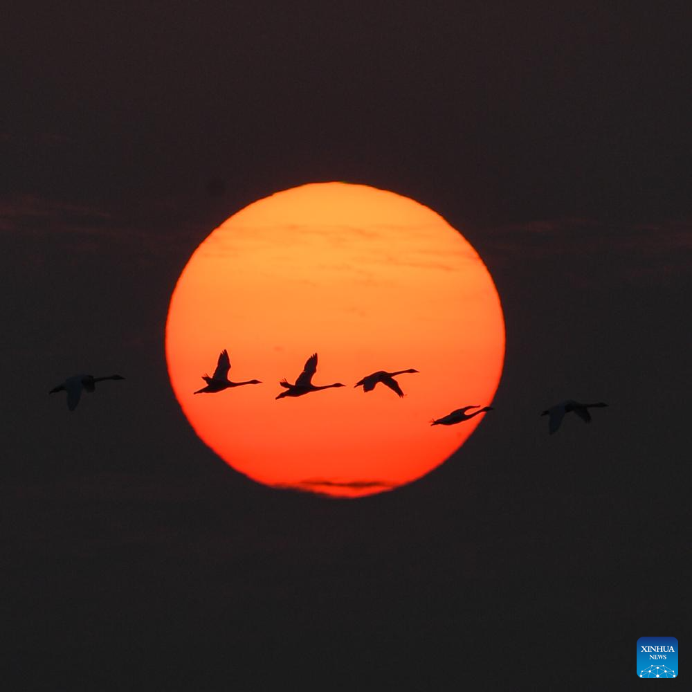 Tundra swans fly over Chongming Dongtan National Nature Reserve at sunset in east China's Shanghai, Nov. 12, 2024. A large number of migrant birds winter at the reserve. (Xinhua/Li Bo)