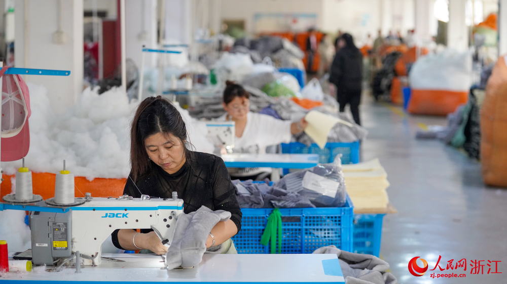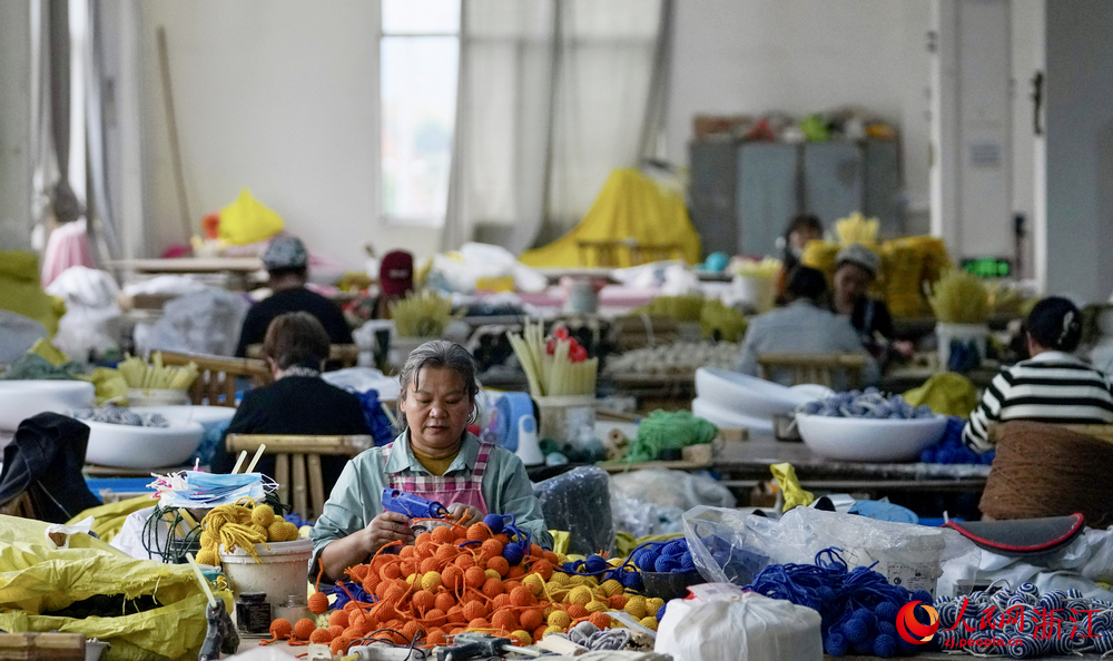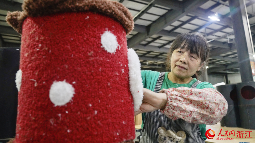 A worker produces pet toys to fulfill orders in the production workshop of a pet toy company in Wenqiao town, Wenling city, a county-level city administered by Taizhou, east China's Zhejiang Province. (People's Daily Online/Guo Yang)