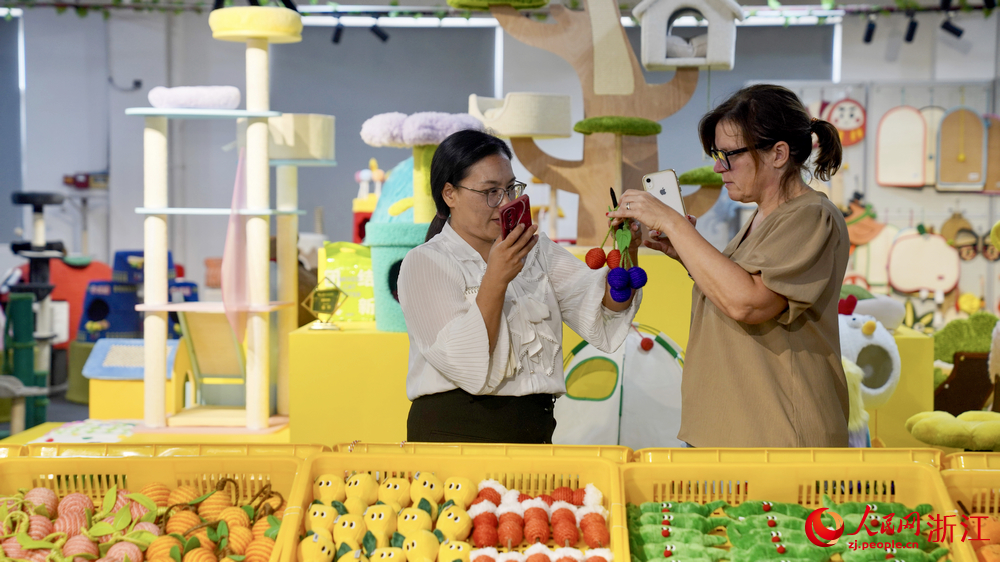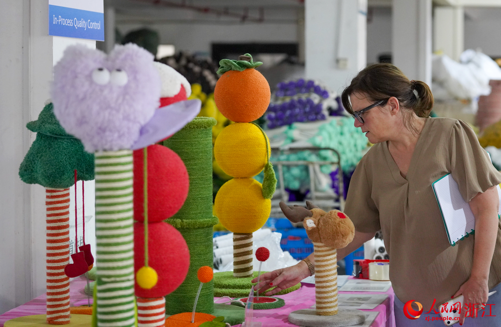 A client purchases pet toys in the production workshop of a pet toy company in Wenqiao town, Wenling city, a county-level city administered by Taizhou, east China's Zhejiang Province. (People's Daily Online/Guo Yang)