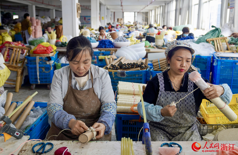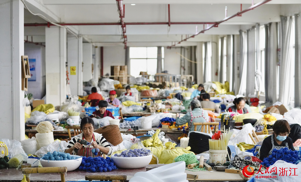 Workers produce pet toys to fulfill orders in the production workshop of a pet toy company in Wenqiao town, Wenling city, a county-level city administered by Taizhou, east China's Zhejiang Province. (People's Daily Online/Guo Yang)