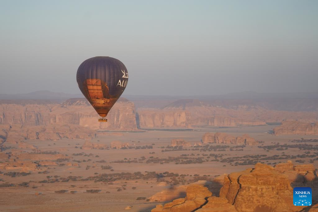 Tourists take a ride in a hot air balloon in AlUla, Saudi Arabia, Nov. 16, 2024. Themed "Hegra Sunrise Sky Tour," a hot air balloon event took place on Saturday at Hegra, a UNESCO World Heritage Site in AlUla. (Xinhua/Luo Chen)