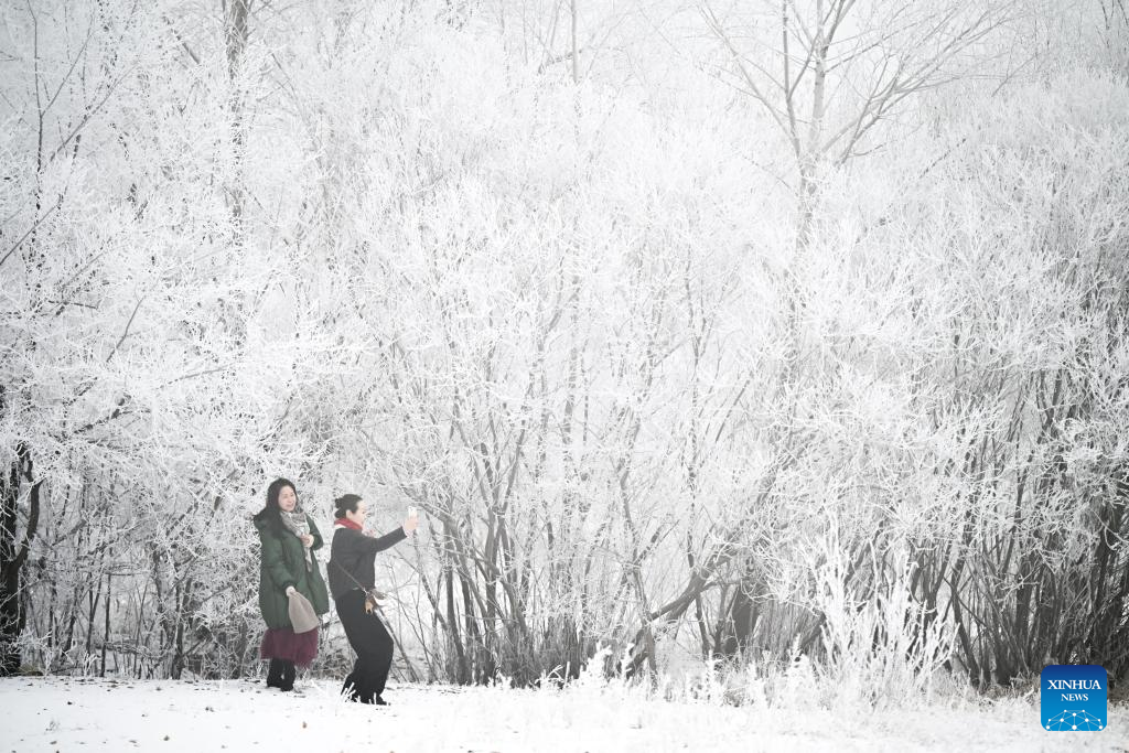 Tourists enjoy the rime scenery in Morin Dawa Daur Autonomous Banner, north China's Inner Mongolia Autonomous Region, Nov. 14, 2024. (Xinhua/Lian Zhen)