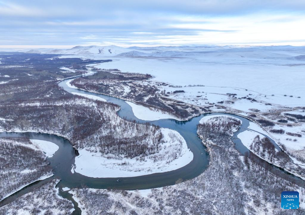 An aerial drone photo taken on Nov. 12, 2024 shows the scenery after snow at a wetland in Ergune, Hulun Buir, north China's Inner Mongolia Autonomous Region. (Xinhua/Lian Zhen)