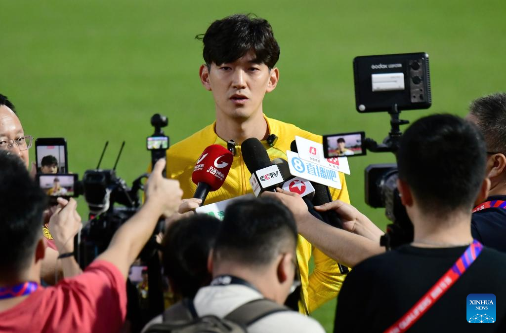 Goalkeeper Yan Junling of the Chinese national men's football team is interviewed during a training session for the upcoming 2026 FIFA World Cup Asian Qualifiers match between China and Japan in Xiamen, east China's Fujian Province, Nov. 17, 2024. (Xinhua/Wei Peiquan)